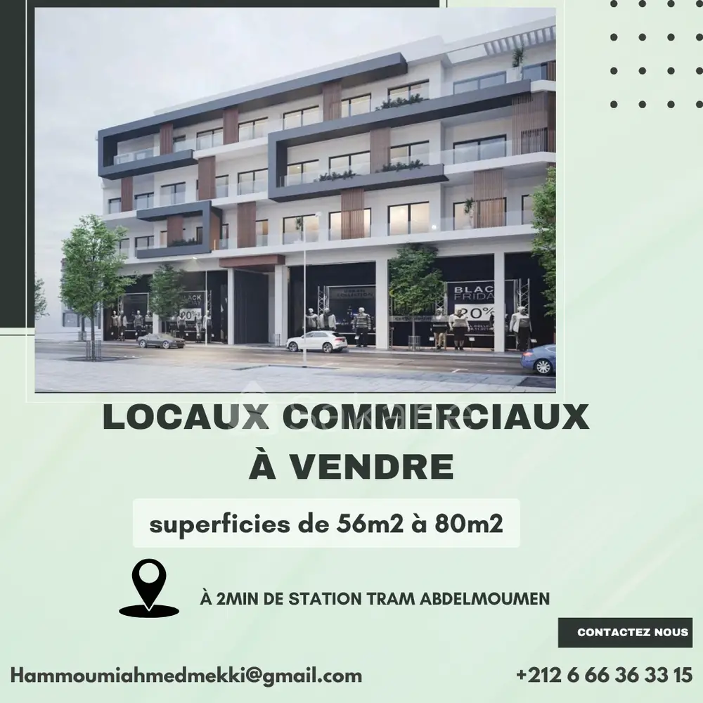 je mets en vente des locaux commerciaux en plein centre ville prés de station de tram ABDELMOUMEN pour des superficies entre 56m2à 80m2 pour le prix à partir de1.4MDh